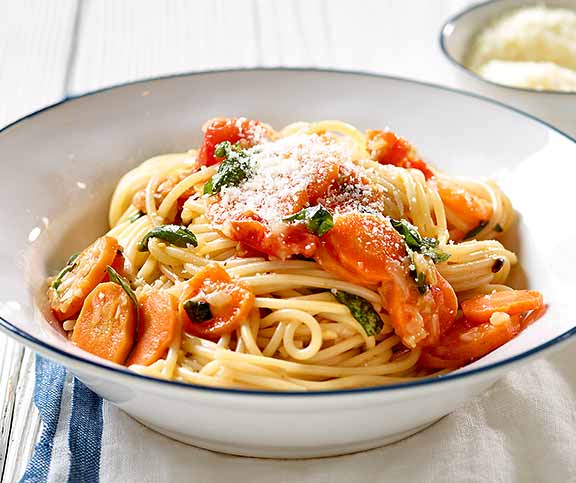 | Rüeblispaghetti | vegan | Karotten,Zwiebel,Knoblauchzehe,Olivenöl,Salz,Cherrytomaten,Spaghetti,Basilikum,Sbrinz (gerieben),Salz,Pfeffer | 49 |