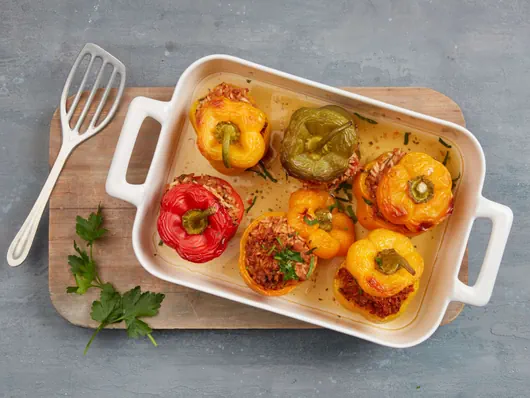 | Gefüllte Peperoni | vegan | Bundzwiebel,Petersilie,Vegi Gehacktes,Reis,Rosinen,Olivenöl,Paprika (mild),Salz,Pfeffer | 86 |