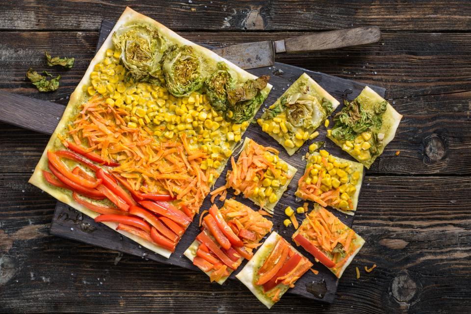| Regenbogen Flammkuchen | Sommer, Mittag | Cremefraiche,Pesto,Salz,Flammkuchenteig,Peperoni,Karotten,Maiskörner (Dose) | 26 |