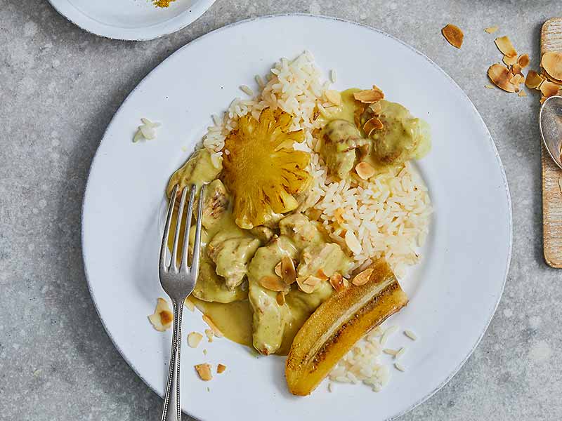| Riz Casimir | kids, vegan | Reis,Currysauce,Banane,Tofu,Ananas (Dose),Rosinen,Kokosmilch,Birnen | 515 |