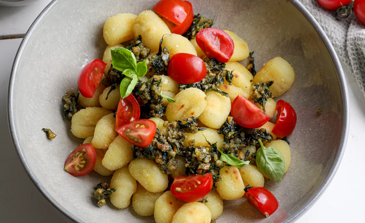 | Gnochi mit Salbeipesto | sommer, vegan | Kartoffeln (mehlig),Mehl,Salz,Muskat,Eier,Salbei,Baumnusskerne,Knoblauchzehe,Olivenöl,Salz,Pfeffer,Tomaten | 79 |