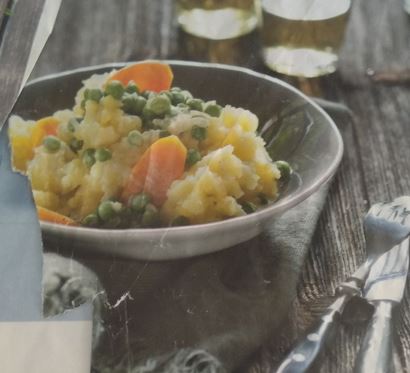 | Kartoffelstampf mit Sauce | Mittag | Kartoffeln (mehlig),Zwiebel,Karotten,TK Erbsli,Butter,Gemüsebouillon,Saucenhalbrahm,Muskat,Salz,Pfeffer | 29 |