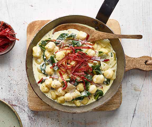 | Gnocchi mit Krautstiel | deftig, veganish | Krautstil,Zwiebel,Gnochi,Saucenhalbrahm,Salz,Pfeffer,Bündnerfleisch | 61 |