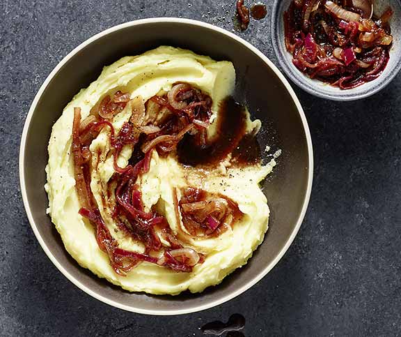 | Kartoffelstock mit Zwiebelsauce | Mittag, vegan | Kartoffeln (mehlig),Milch,Butter,Salz,Pfeffer,Zwiebel,Olivenöl,Salz,Birnendicksaft,Aceto balsamico | 100 |