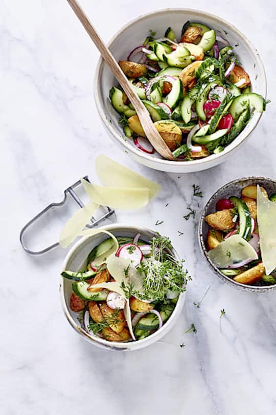 | Gurken Kartoffel-Salat | sommer, leicht, vegan | Gurken,Zwiebel (rot),Aceto balsamico bianco,Rohzucker,Kartoffeln (festkochend),Olivenöl,Salz,Pfeffer,Radiesli,Dill,Olivenöl,Kresse,Sbrinz | 56 |