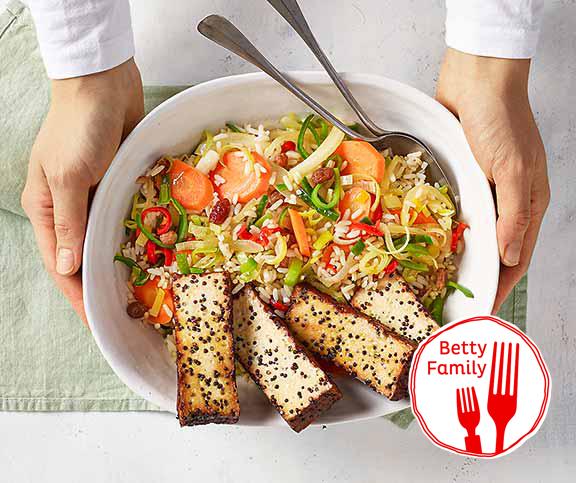 | Gemüsereis mit Tofu | leicht, vegan | Reis,Rosinen,Karotten,Zwiebel,Lauch,Peperoncino,Tofu (geräuchert),Sojasauce | 51 |