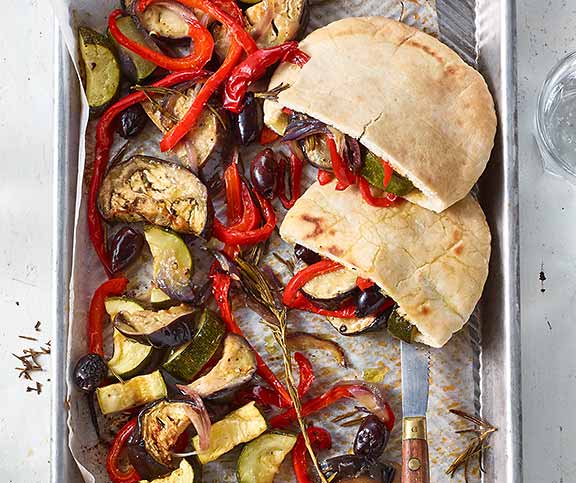 | Ofen-Antipasti im Pitabrot | Mittag, Vegan, leicht | Peperoni,Zuchetti,Aubergine,Zwiebel (rot),schwarze Oliven,Rosmarin,Öl (Salat),Salz,Pfeffer,Pita-Brote | 102 |