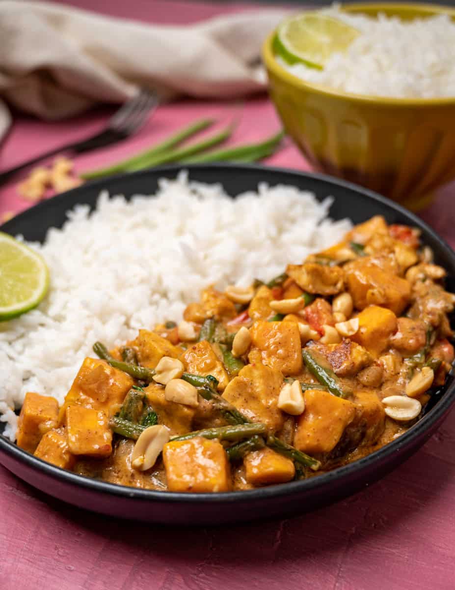 | Masamann Curry | deftig, vegan | Kokosmilch,Massaman Currypaste,Erdnussmus,Basmatireis,Kartoffeln (festkochend),TK Bohnen,Broccoli,Tofu,Sojasauce,Zwiebel | 507 |
