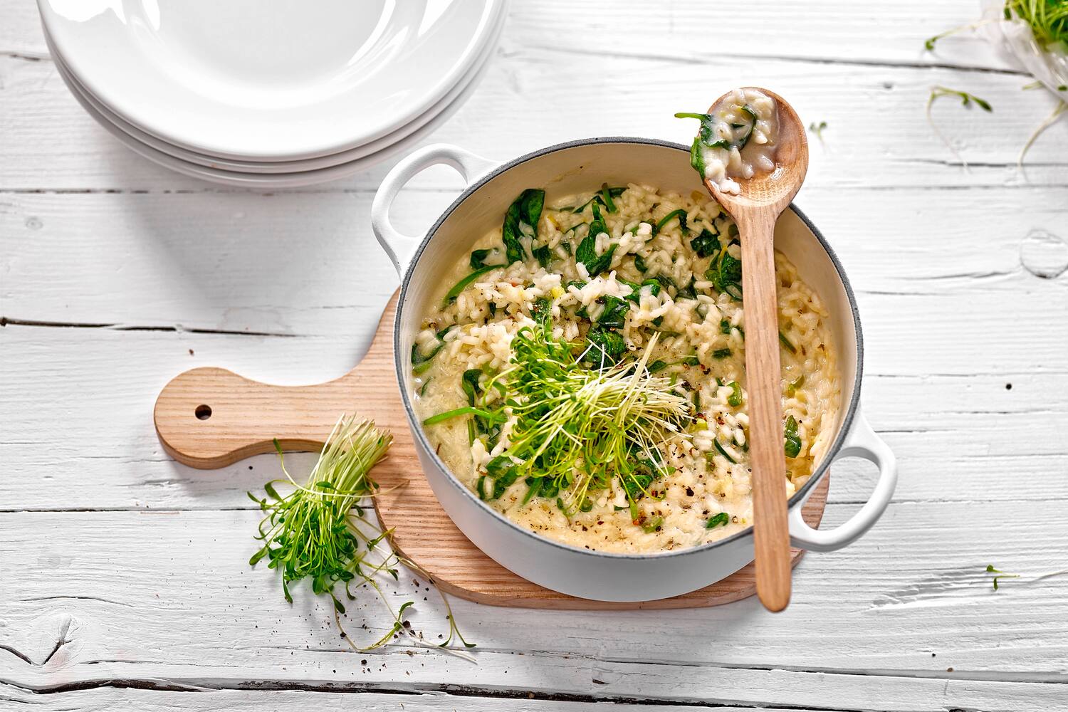 | Frühlings-Risotto | Frühling | Öl,Risottoreis,Gemüsebouillon,Zitrone (Bio),Frischkäse,Jungspinat,Pfeffer,Kresse | 20 |