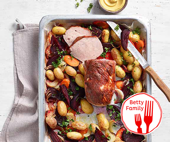 | Fleischkäse mit Ofengemüse | Mittag | Fleischkäse,Zwiebeln,Randen,Karotten,Kartoffeln (festkochend),Öl,Salz,Pfeffer | 19 |