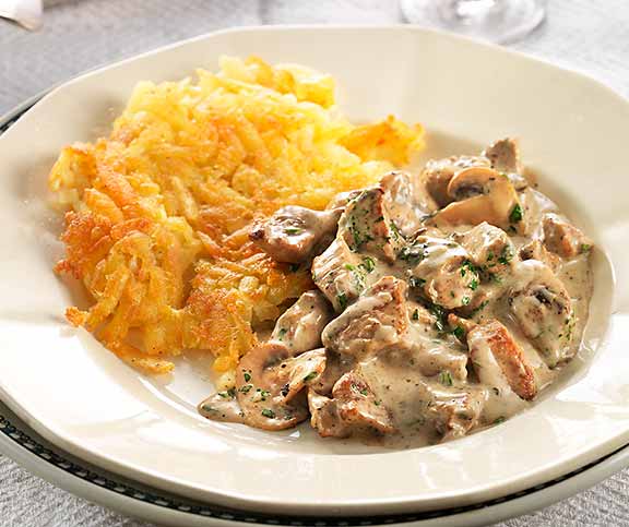 | Zürich Geschnetzeltes | vegan, deftig, Ruckli | Rösti (Fixfertig),Vegi Geschnetzeltes,Butter,Zwiebel,Mehl,Weisswein,Champignons,Gemüsebouillon,Vollrahm | 83 |