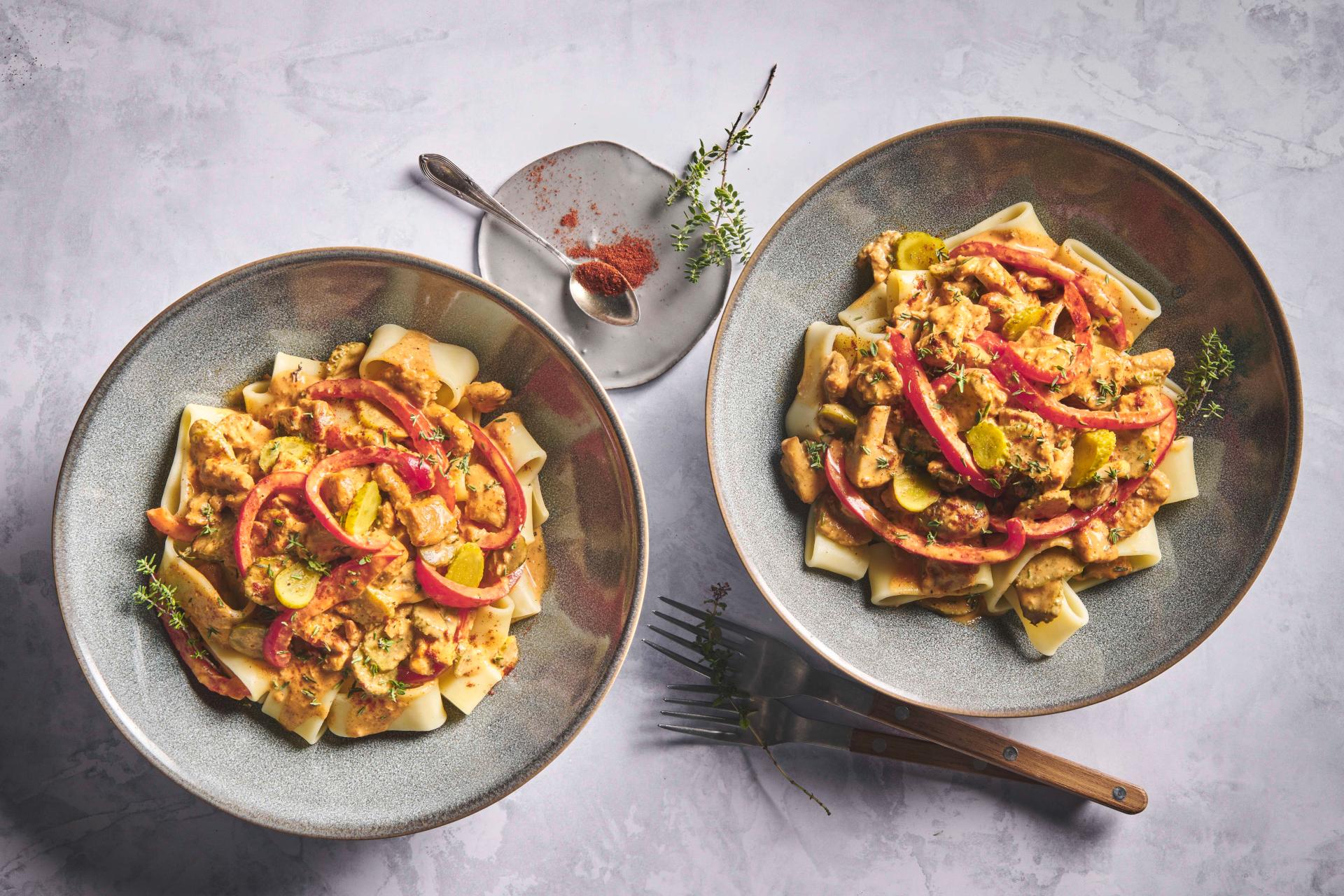 | Vegi-Stroganoff | vegan | Vegi Geschnetzeltes,Olivenöl,Paprika (mild),Champignons,Halbrahm,Milch,Pfeffer,Thymian,Essiggurken,Salz,Peperoni | 17 |
