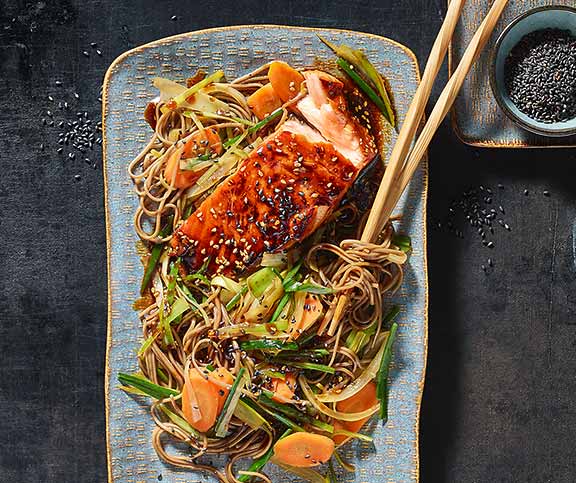 | Soba-Nudeln mit Lachs | Fisch, festlich | Lachsfilet ohne Haut,Teriyaki-Sauce,flüssiger Honig,Sesam,Soba Nudeln,Lauch,Karotten,Zwiebel,Öl (Salat),Teriyaki-Sauce,Gemüsebouillon,Öl (Salat),schwarzer Sesam | 101 |