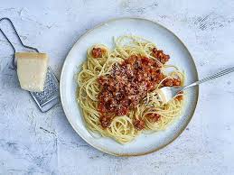 | Spaghetti Bolognese | mittag, kids, vegan | Sojaschnetzel,Spaghetti,Büchsentomaten,Tomatenpüree,Zwiebel,Knoblauchzehe,Rotwein,Nelken (gemahlen),Lorbeer | 512 |
