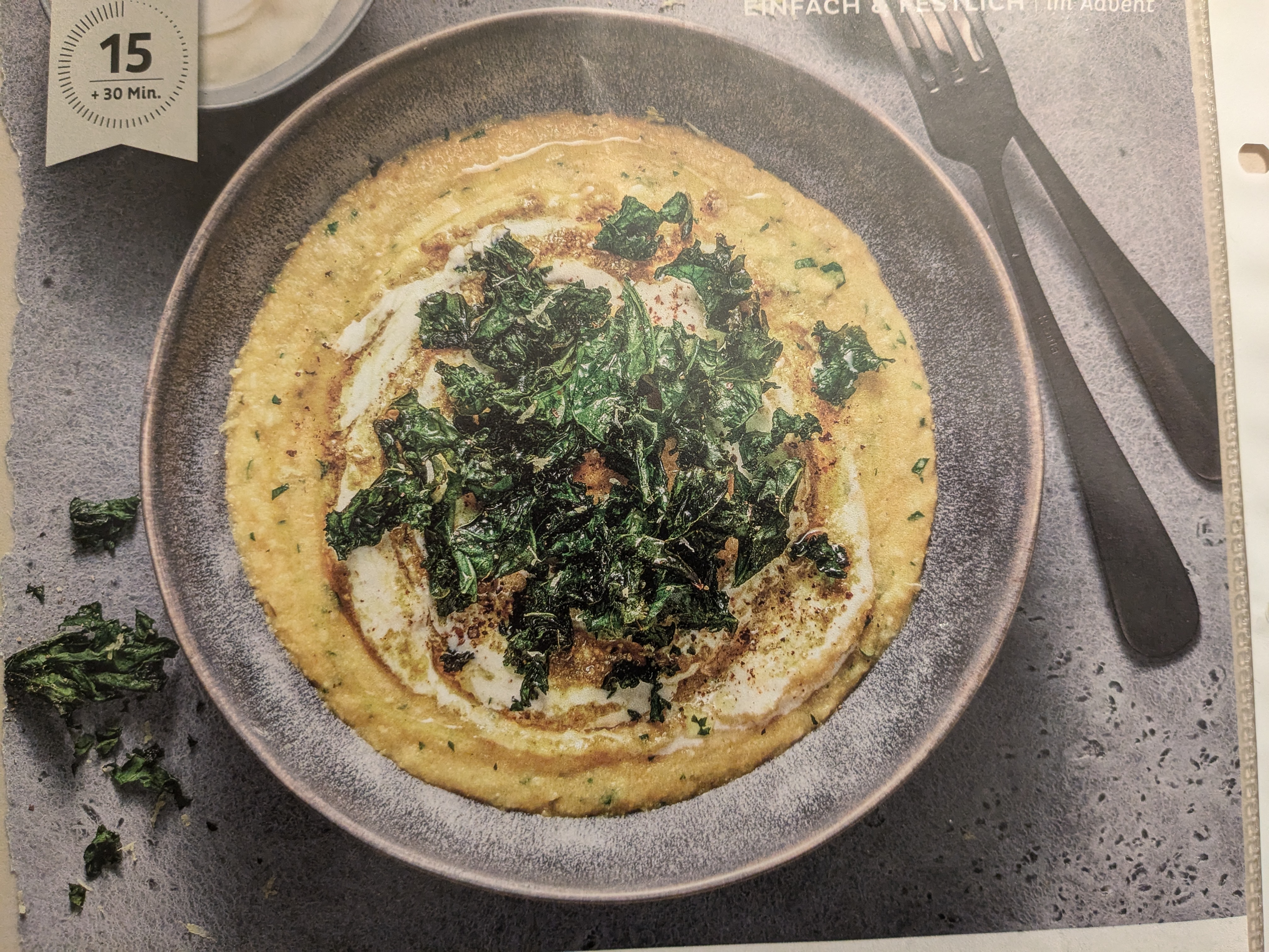 | Pesto-Polenta mit crunchy Kale | deftig | Federkohl,Olivenöl,Salz,Pfeffer,Gemüsebouillon,Bramata (Polenta),Petersilie,Gruyère (gerieben),Pesto,Cremefraiche,Pfeffer,Zitrone (Bio) | 103 |