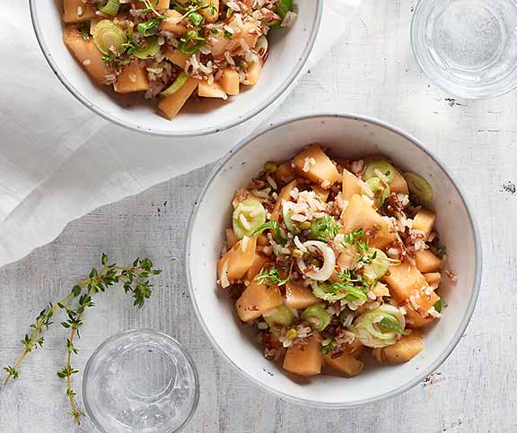 | Reissalat mit Melone und Speck | sommer, vegan | Gemüsebouillon,Reis,Senf (grobkörnig),Aceto balsamico bianco,Öl (Salat),Salz,Pfeffer,Zitronenmelisse,Bratspeck,Melone (Charentais),Frühlingszwiebeln | 89 |