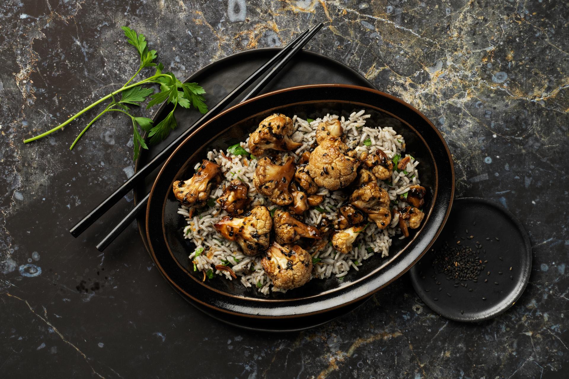 | Gebackener Homig-Sesam-Blumenkohl | leicht, vegan | Sojasauce,Limettensaft,flüssiger Honig,Maizena,Blumenkohl,schwarzer Sesam,Sesamöl,Knoblauchzehe,schwarzer Sesam,Basmatireis,Wasser,Salz,Röstzwiebeln,Petersilie | 106 |