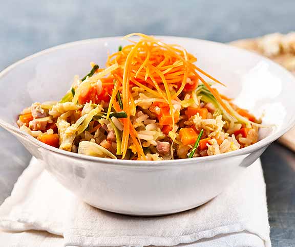 | Gebratener Reis | leicht | Lauch,Karotten,Zwiebel,Gemüsebouillon,Reis,Schinkenwürfeli,Olivenöl,Sojasauce,Pfeffer,Eier,Karotten | 42 |