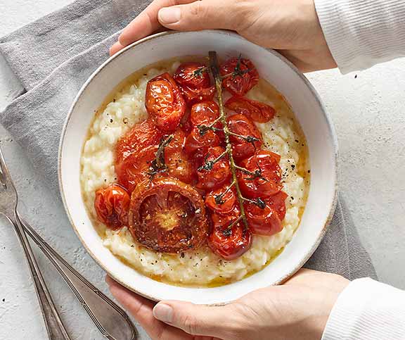 | Risotto mit Ofentomaten | sommer, herbst | Tomaten,Zitrone (Bio),Olivenöl,Fleur de Sel,Pfeffer,Zwiebel,Olivenöl,Risottoreis,Weisswein,Wasser,Salz,Butter | 94 |