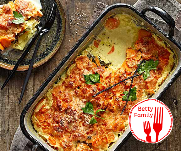 | Rüebli-Kartoffel-Gratin | deftig | Kartoffeln (mehlig),Petersilie,Karotten,Vanilleschote,Milch,Vollrahm,Salz,Pfeffer,Reibkäse | 92 |