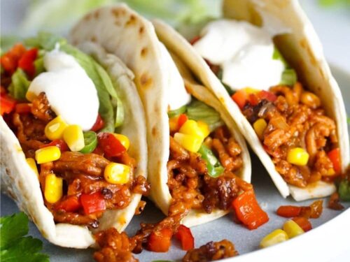 | Fajitas mit gehacktem | vegan, kids | Weizentortillas,Kidneybohnen,Vegi Gehacktes,Rotwein,Tomatenpüree,Zwiebel,Maiskörner (Dose),Büchsentomaten,Avocado,Gurken | 99 |